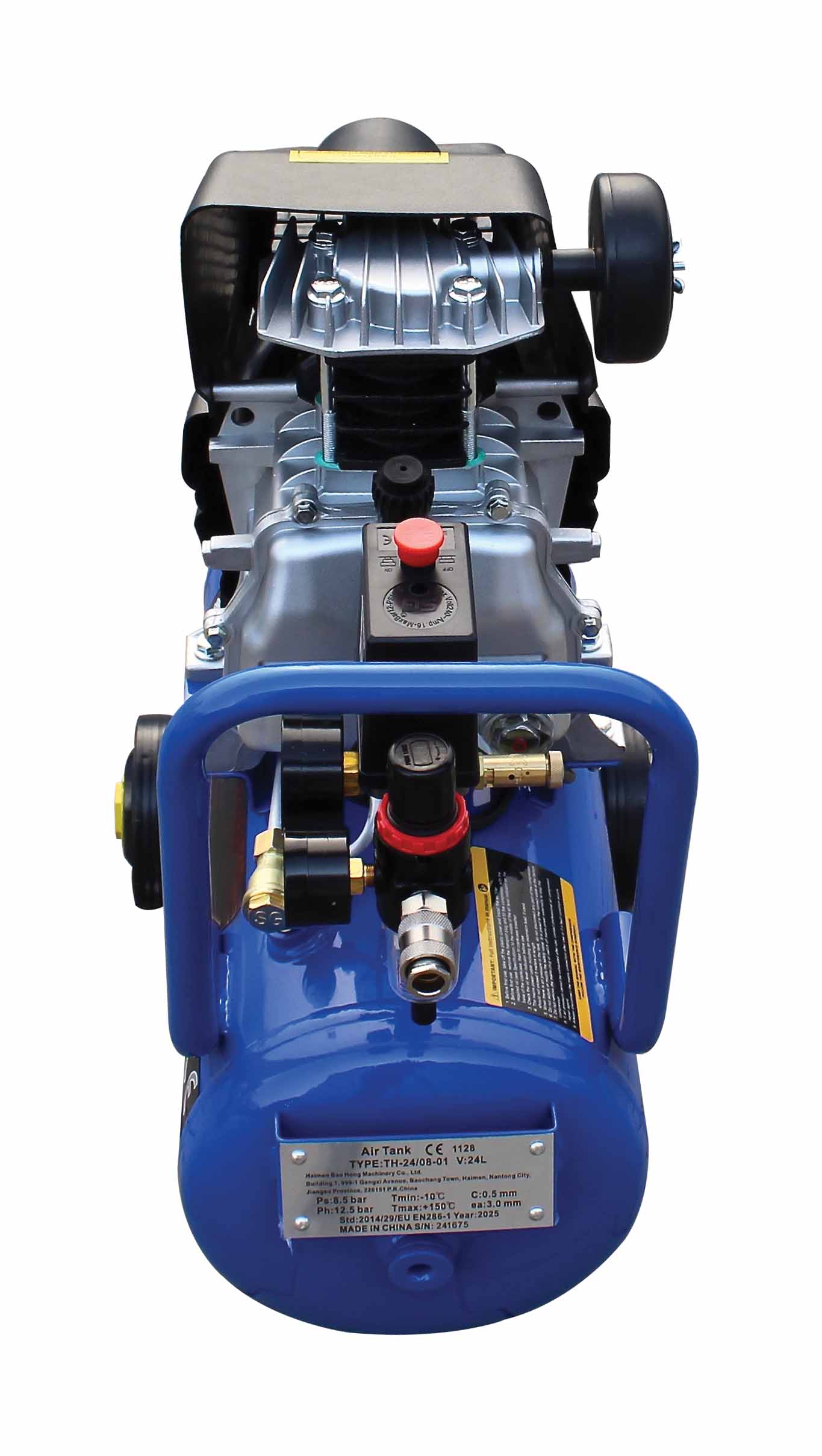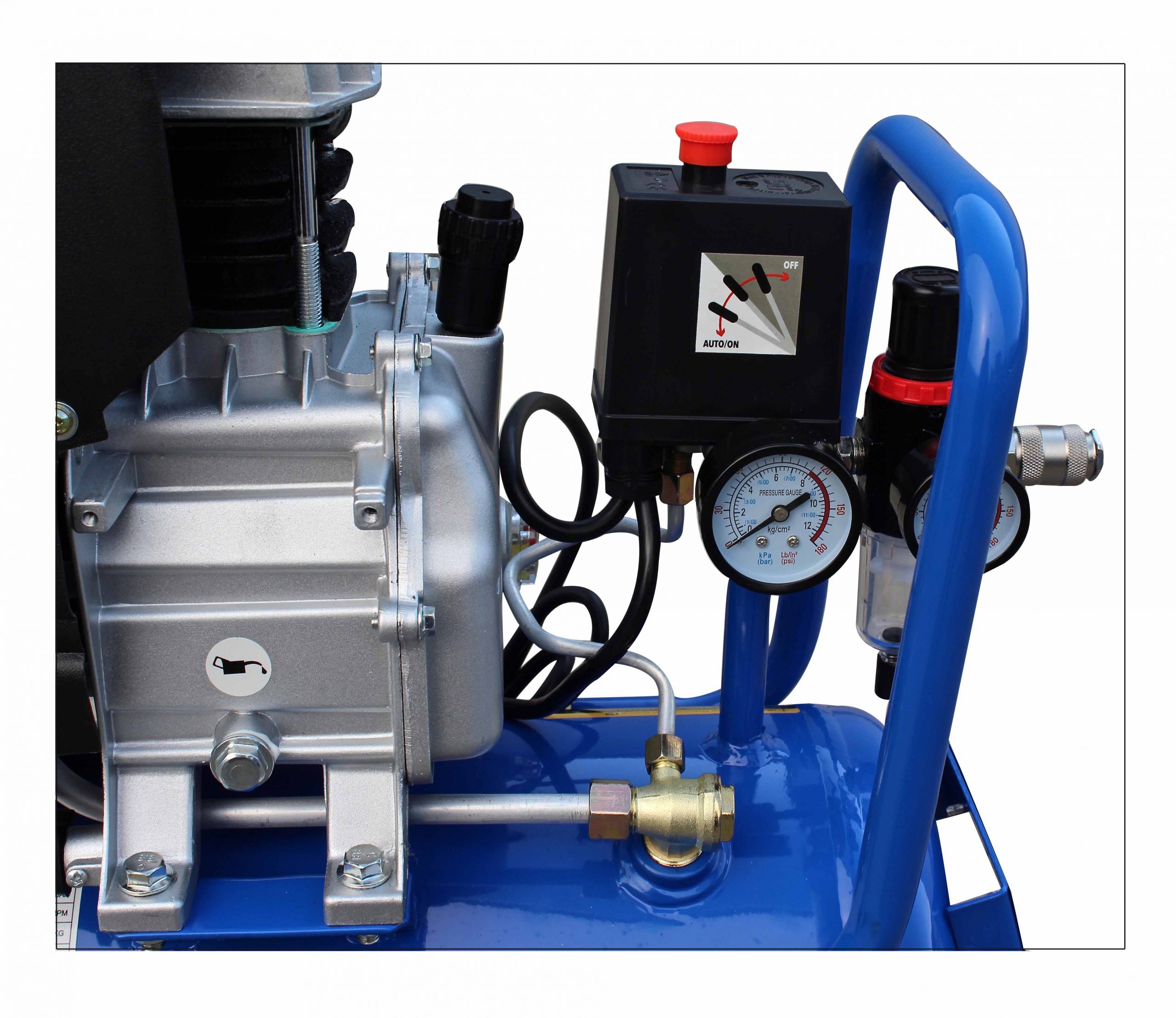 • Wolnoobrotowy jednotłokowy kompresor olejowy z zbiornikiem o pojemności 24 litrów.