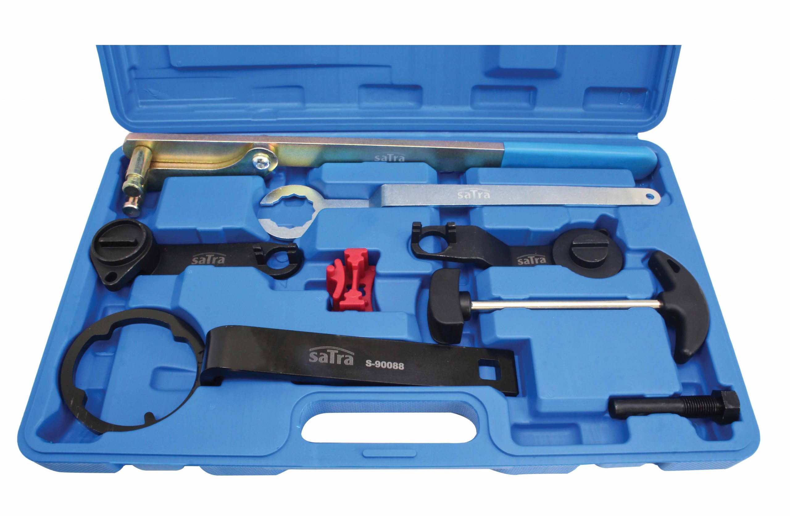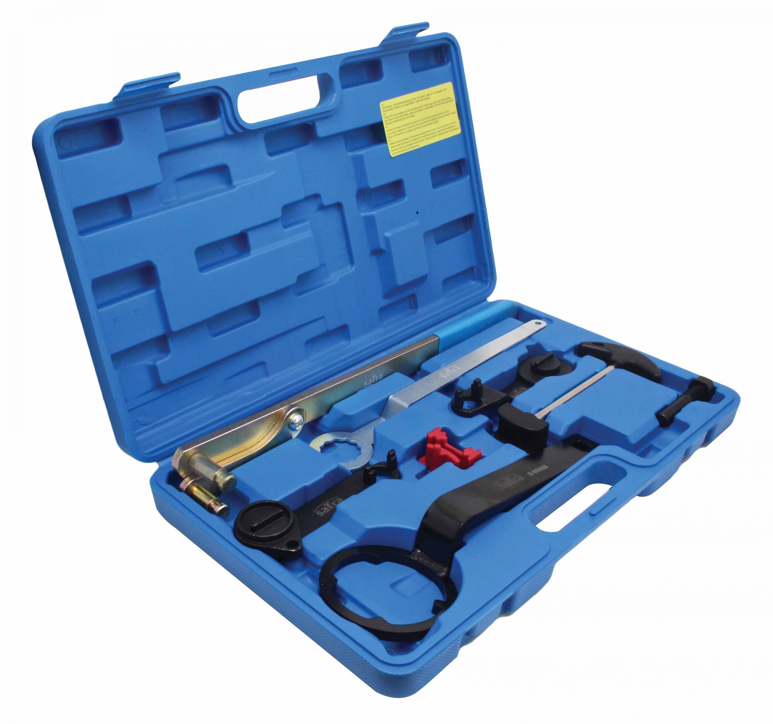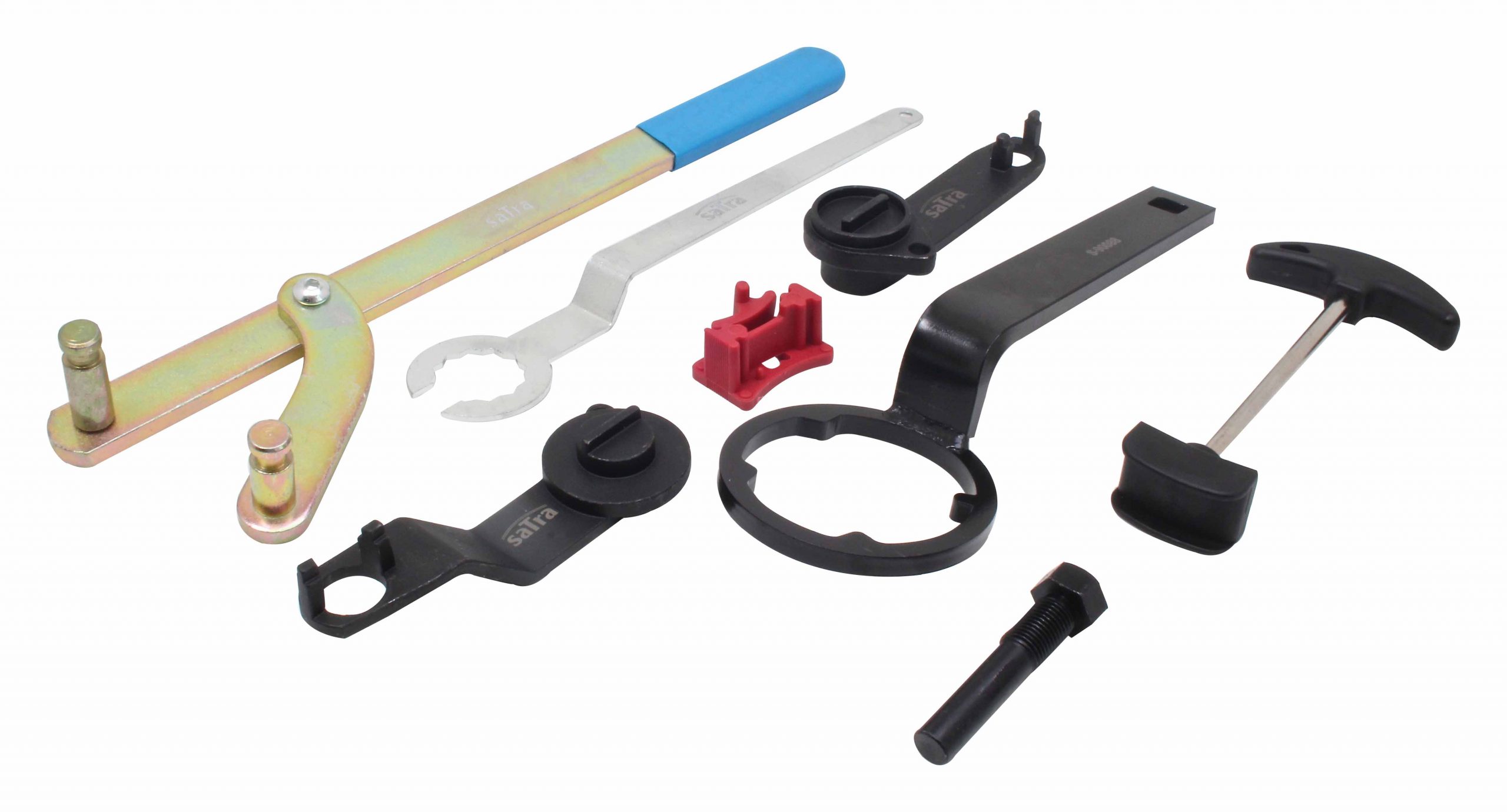 Zestaw zawiera m.in. blokadę wału korbowego, koła zębatego rozrządu, napinacz koła pasowego, Klucz koła pasowego oraz trzpień do wału.