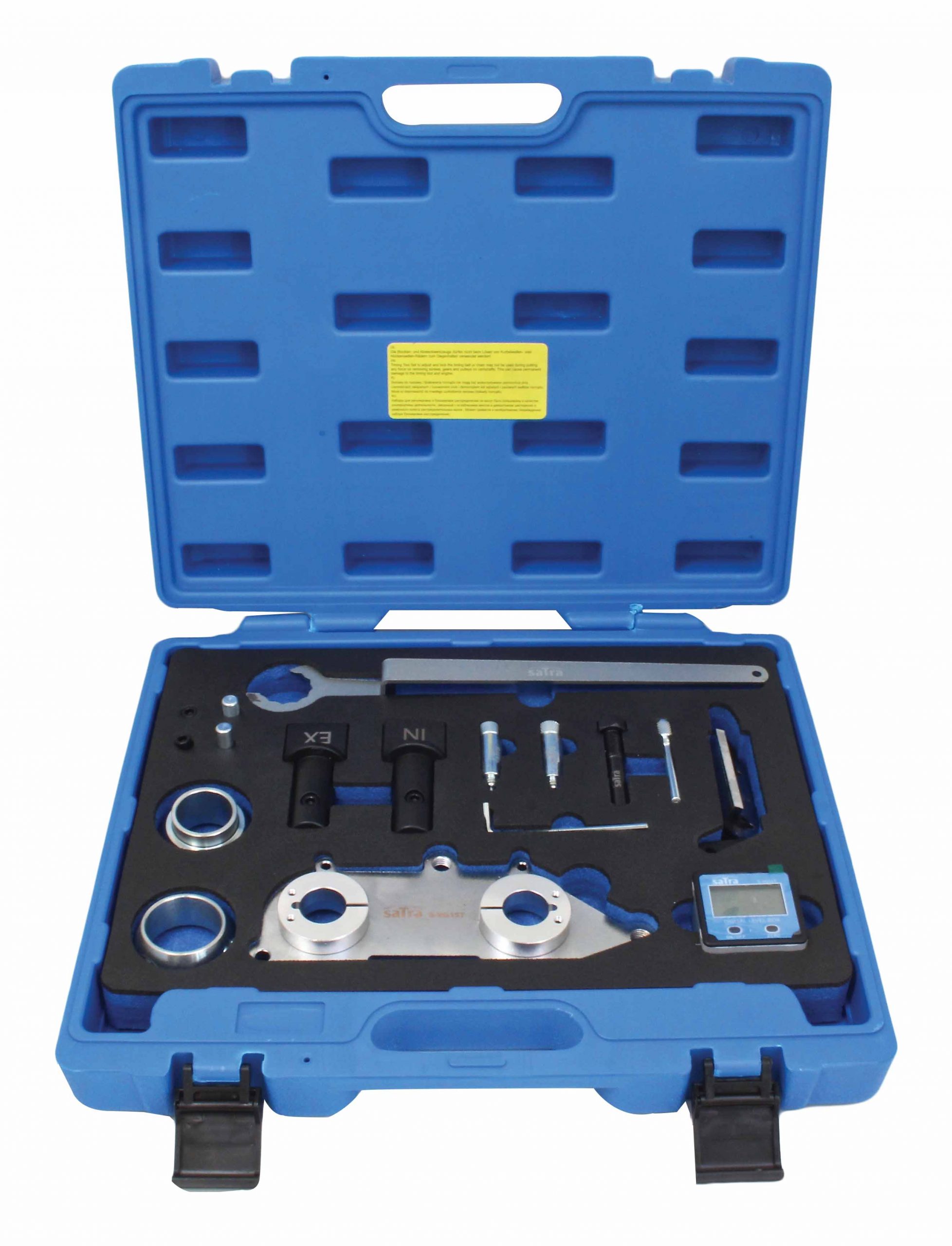 Specjalistyczny zestaw marki SATRA do ustawiania, wyrównywania i sprawdzenia walka rozrządu w samochodach z silnikiem benzynowym – 4 cylindrowym TSI VAG z ACT.