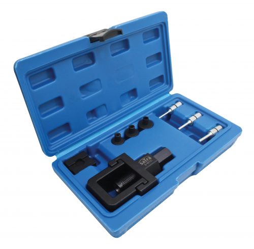 Mały specjalistyczny zestaw marki SATRA przystosowany do zakuwania i rozkuwania łańcuchów napędowych w motocyklach z możliwością wykorzystania także do łańcucha rozrządu.