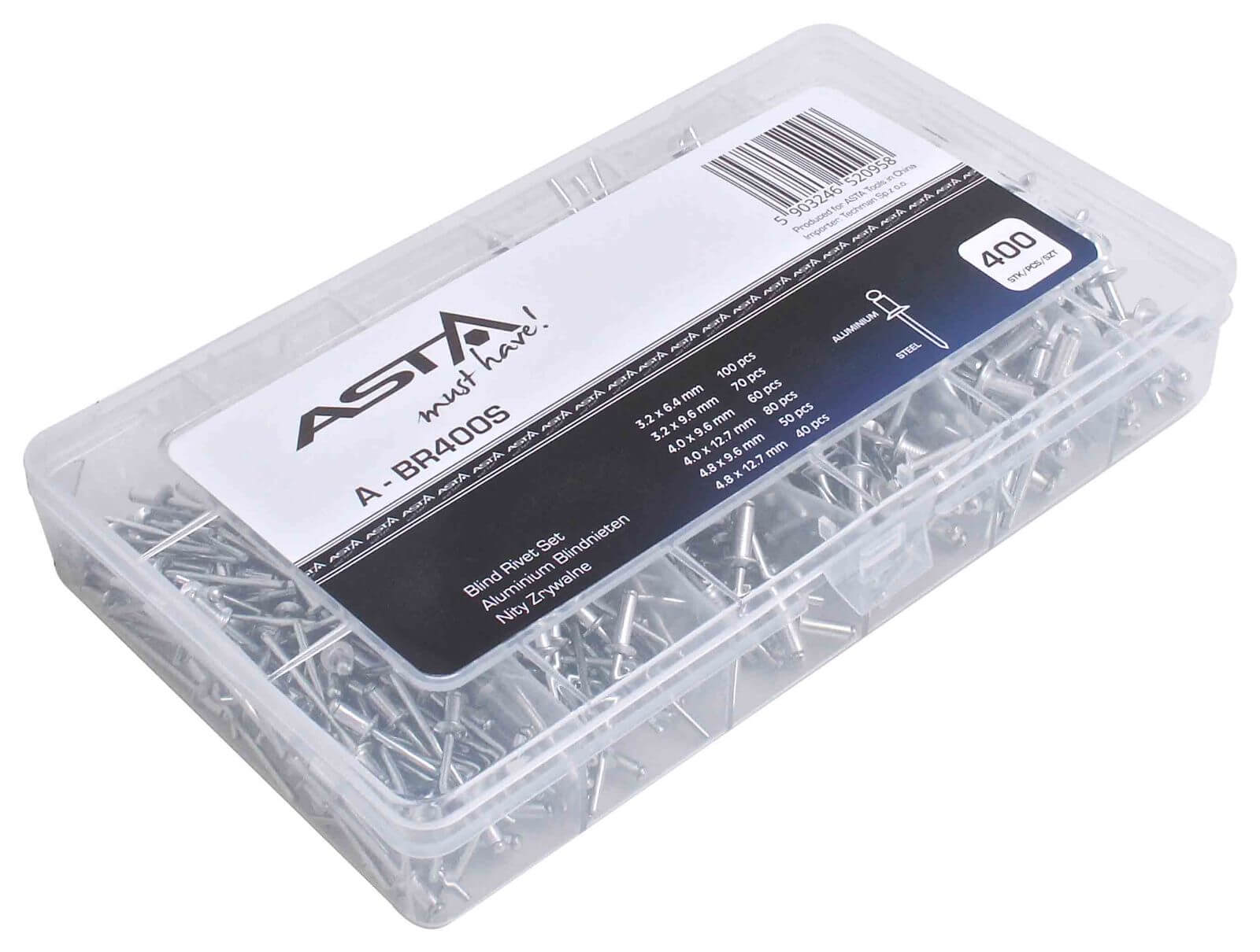 3.2 x 6.4 mm x 100 szt 3.2 x 9.6mm x 70 szt 4.0 x 9.6mm x 60 szt 4.0 x 12.7 mm x 80szt 4.8 x 9.6 mm x 50szt 4.8 x 17.7 mm x 40szt