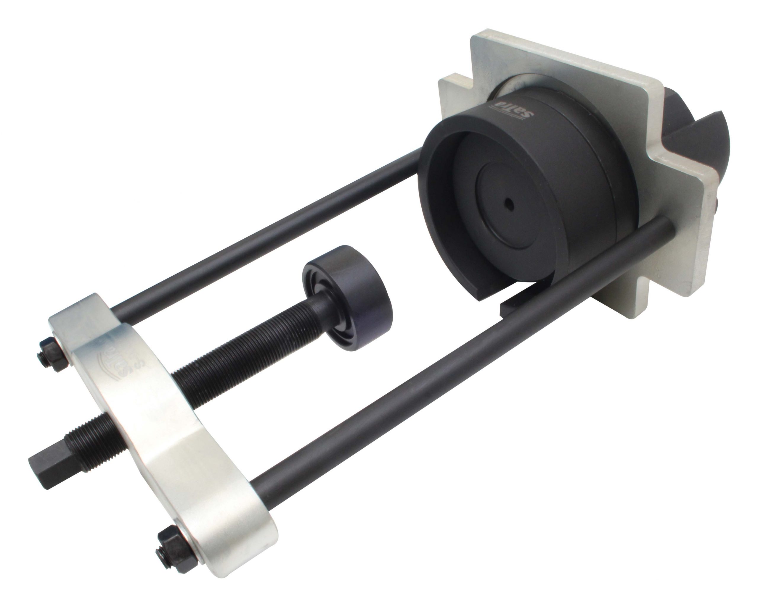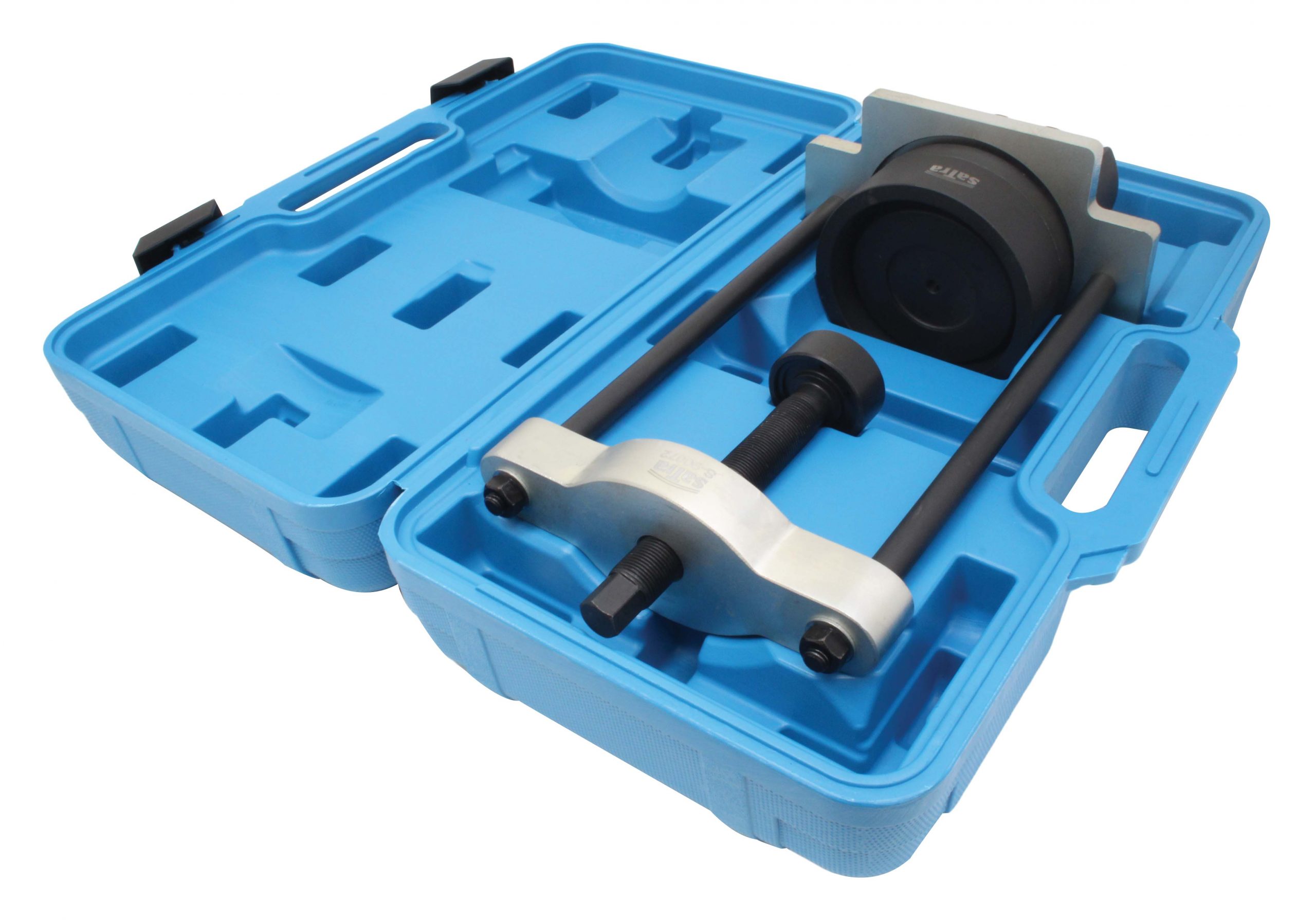 Specjalistyczny zestaw marki SATRA specjalnie zaprojektowany do demontażu tulei tylnego wzdłużnego wahacza – cukierków, w samochodach marki FORD MK4 oraz VOLVO bez konieczności demontowania innych podzespołów.