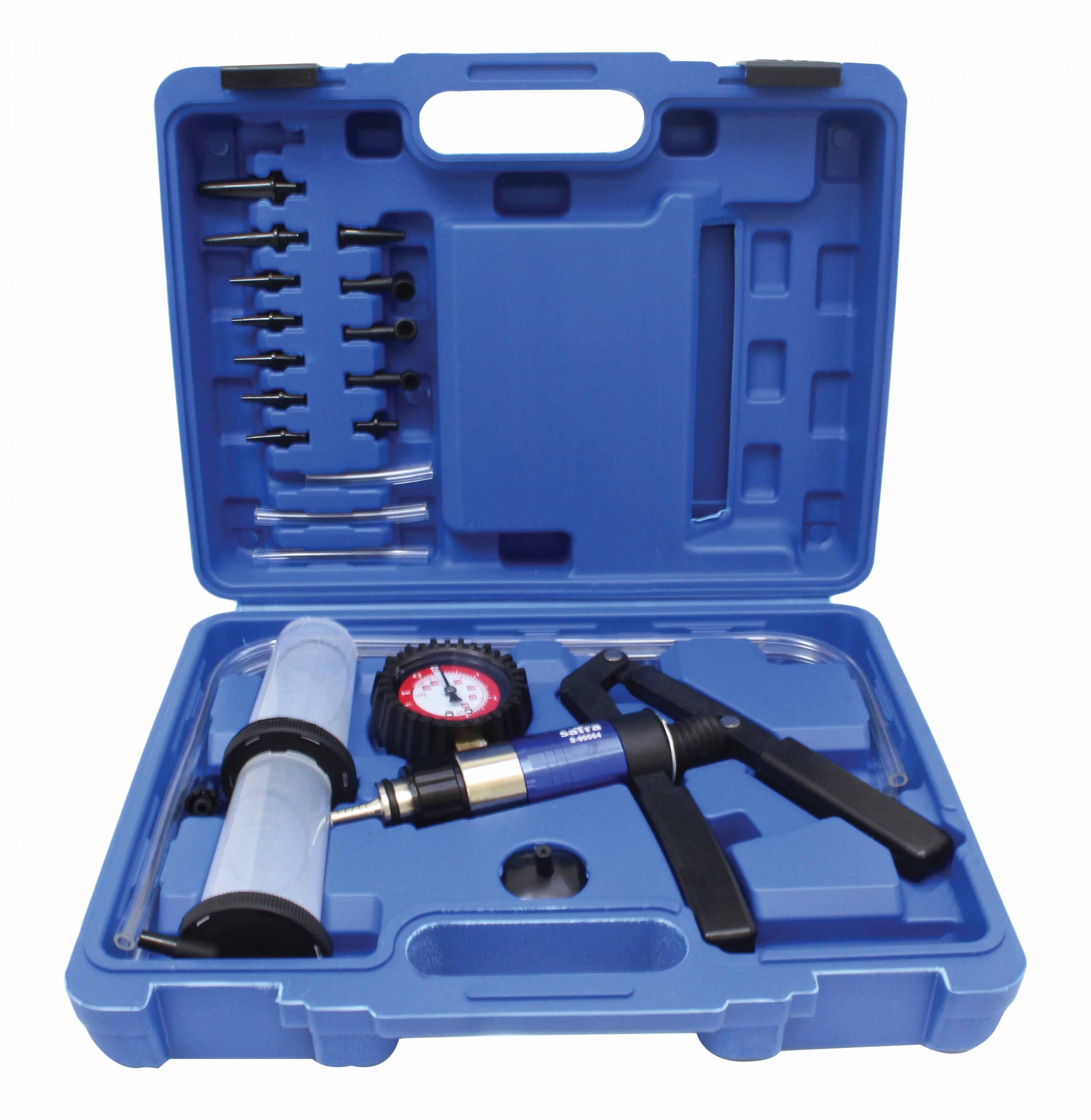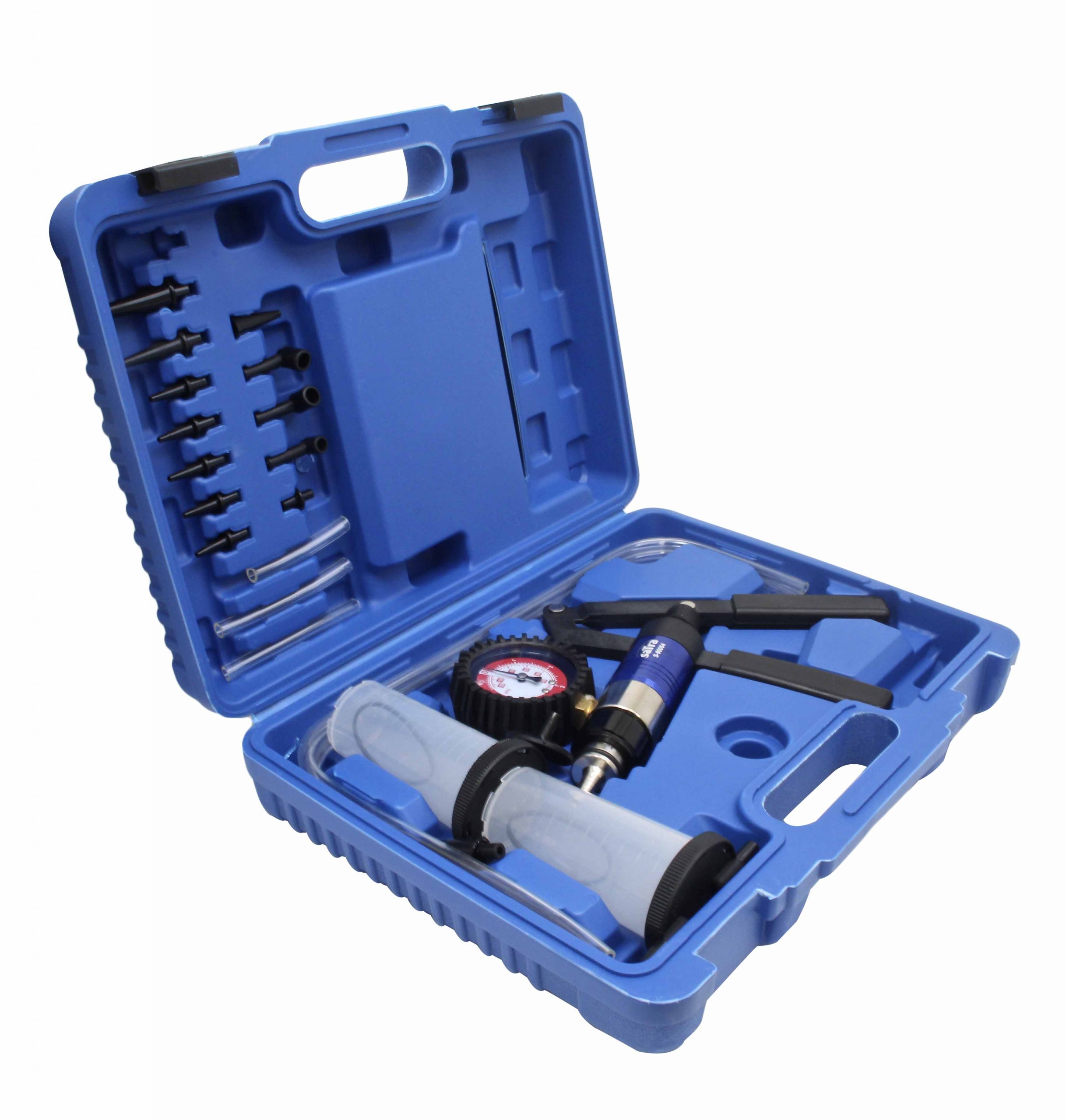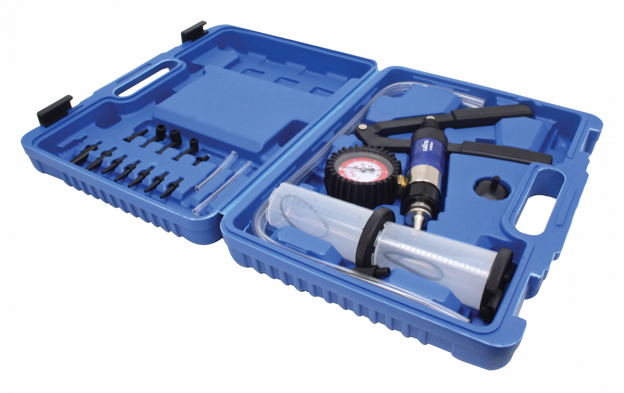 Zestaw służący do odpowietrzania i wymiany płynu hamulcowego, jak również do sprawdzania m.in. szczelności zaworów kontrolujących wlot powietrza, modulatora ciśnienia, sterowników wyprzedzania podciśnienia , zaworów wspomagania hamulców w skrzyniach biegów , gaźnikach.